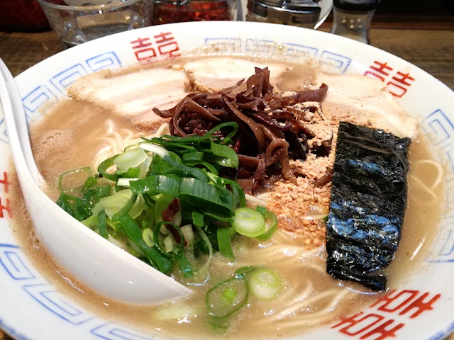 出てきたラーメンの麺を啜る。博多豚骨ラーメンだ。ちょいと太く加水高めかな?ともあれ、大盛りでもしっかりと食感と旨味を最後まで保っていた。