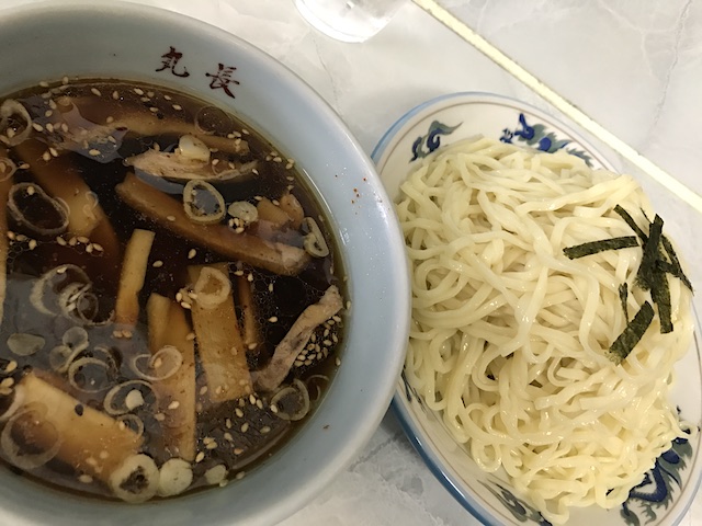 20177月28 丸長@宮原 ツイッターで見かけ訪問。 つけ麺(600円)+大盛り(100円)を注文。 まずは麺を一箸。ややボソッとしており、味は余り無い。 細切りチャーシュー、メンマ、白ネギ、七味唐辛子、そして油が浮く汁。これもそのままでは塩辛く、飲もうとは思わない。 これが汁に麺をつけ啜ると、甘・辛・酸味が先頭の機関車役で、魚介のアクセントが特徴である出汁の旨味を纏った麺の味が、重連編成列車の様にどこまでも続く。食べ手はその力強さに納得させられてしまった。 埼玉県さいたま市北区奈良町12-15 営業時間 11:00〜14:20(L.O) 定休日 水
