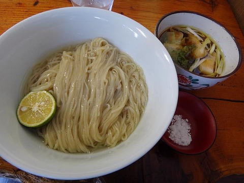 濃厚な昆布と鰹の水だし(火を入れない)に浸された細やや平打ち麺は、まるで冷やしラーメンの様な見た目。箸で掴み、最初はこれにつけて食べてほしいという、塩が入る小皿へとゆっくり下ろす。鰹は序盤にチラと姿を見せただけで、後は昆布の濃厚な旨味に取って代わった。昆布は特有のぬめりも出しており、このつけ麺の大きな特徴となっていた。日本蕎麦並みに長い麺を、箸を滑らさない様、慎重に塩やつけ汁へ浸す。ぬめりのおかげで喉越しは良好。旨味やぬめりに強い存在感の昆布の中から、辛うじて小麦の旨味をすくい取った。